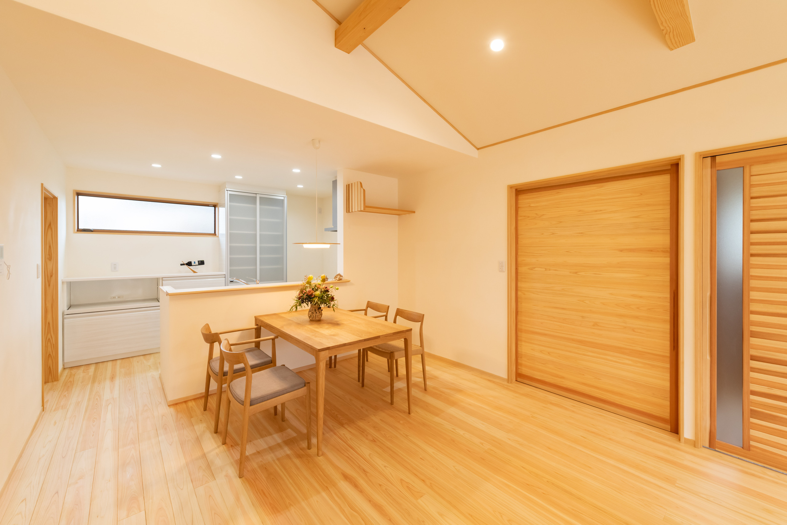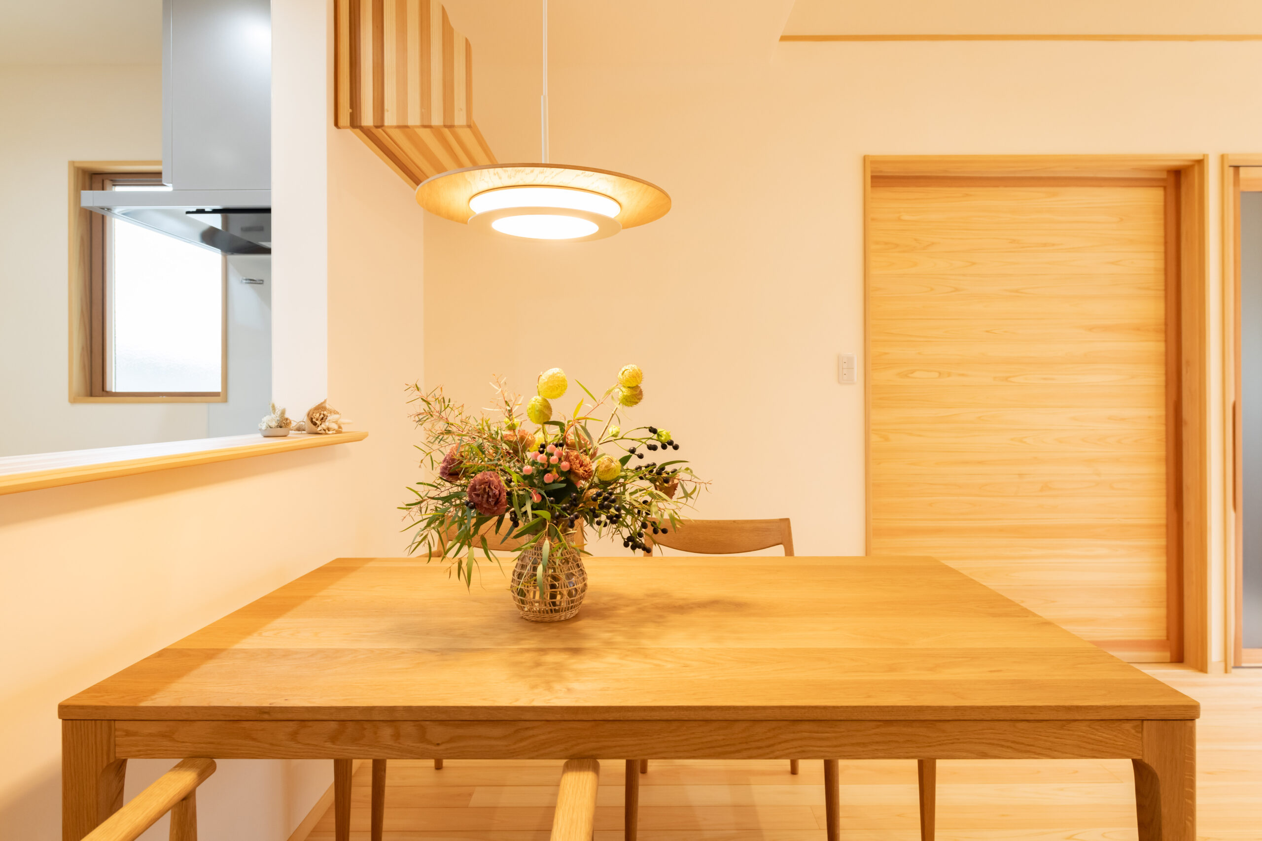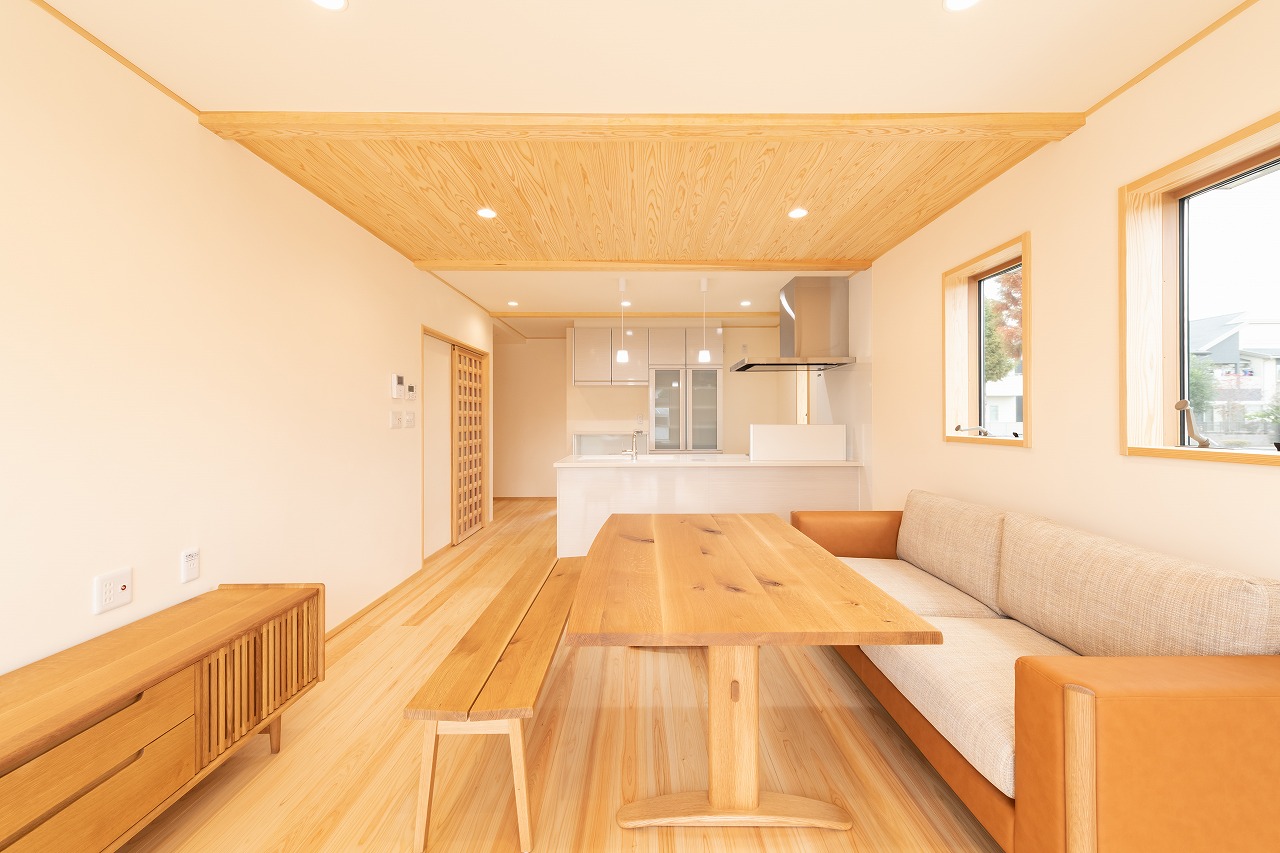床材は厚さ27mmの上質な桧を、壁には調湿・消臭効果に優れた漆喰をふんだんに使用。丸和建設が大切にしている標準仕様で「自然に開放的で、健康に配慮した暮らし」を叶えました。