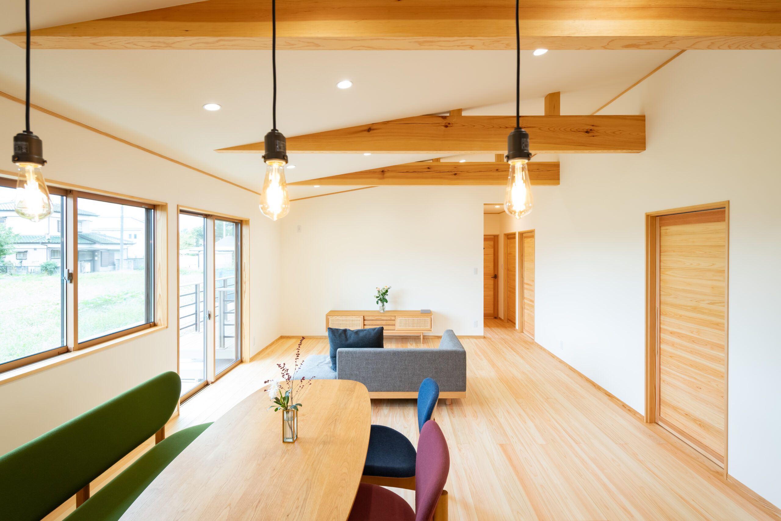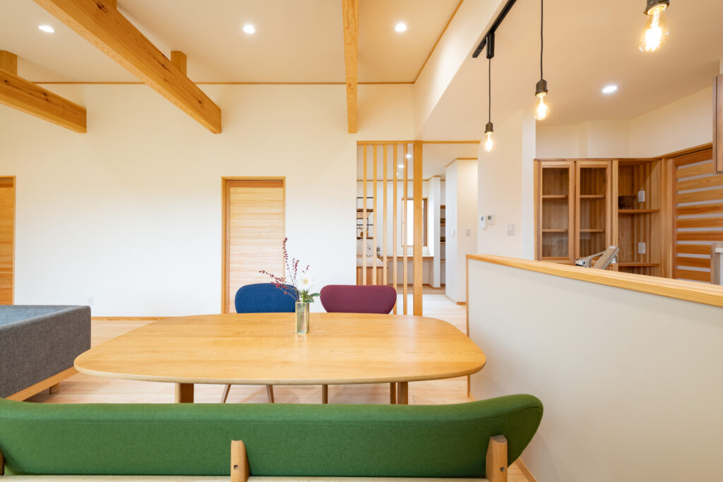 LDKは約22帖の広々とした空間。平屋ならではの勾配天井がつくる開放感の中に、光と風がやわらかく通り抜けます。