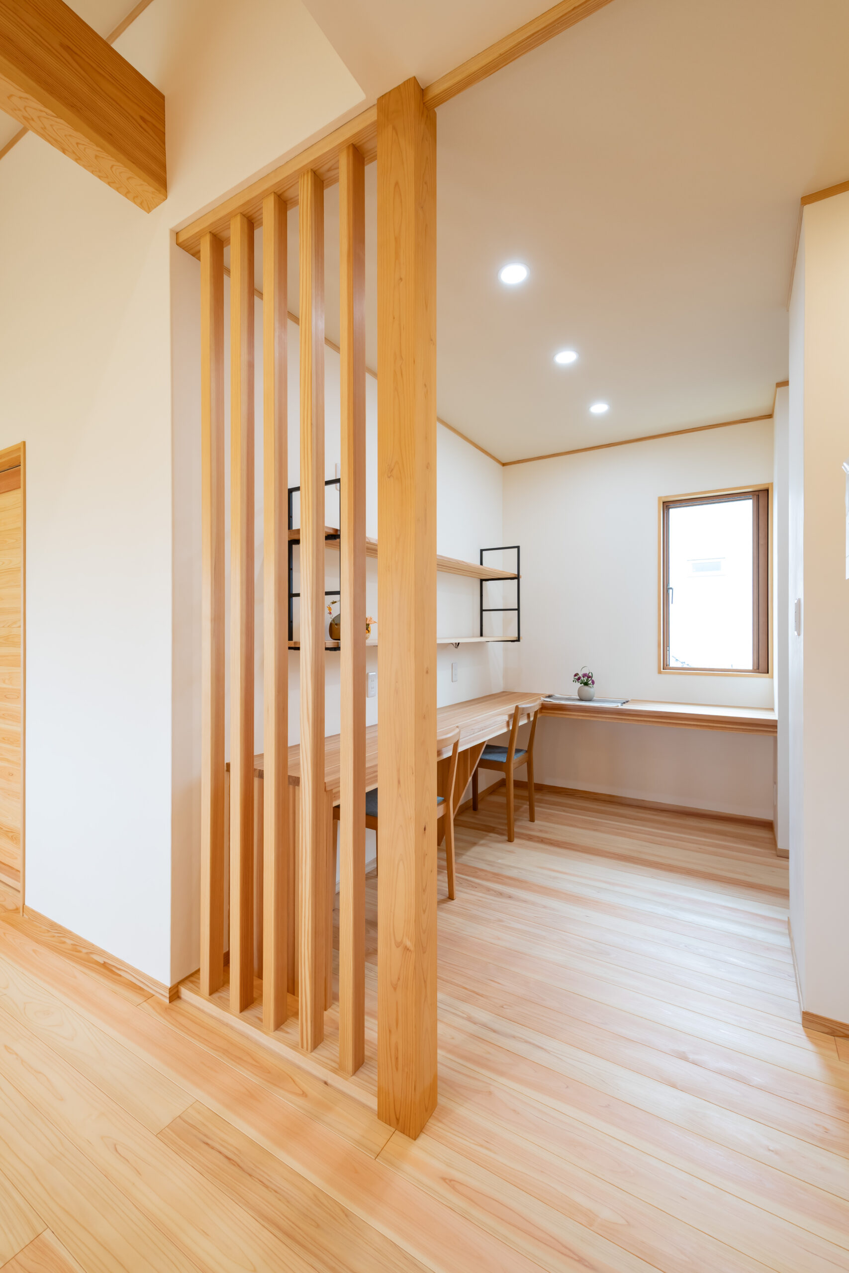 床材は弊社標準仕様の無垢の桧材を使用。素足で歩くたびに木の温もりが伝わり、年月とともに深まる風合いが暮らしを彩ります。