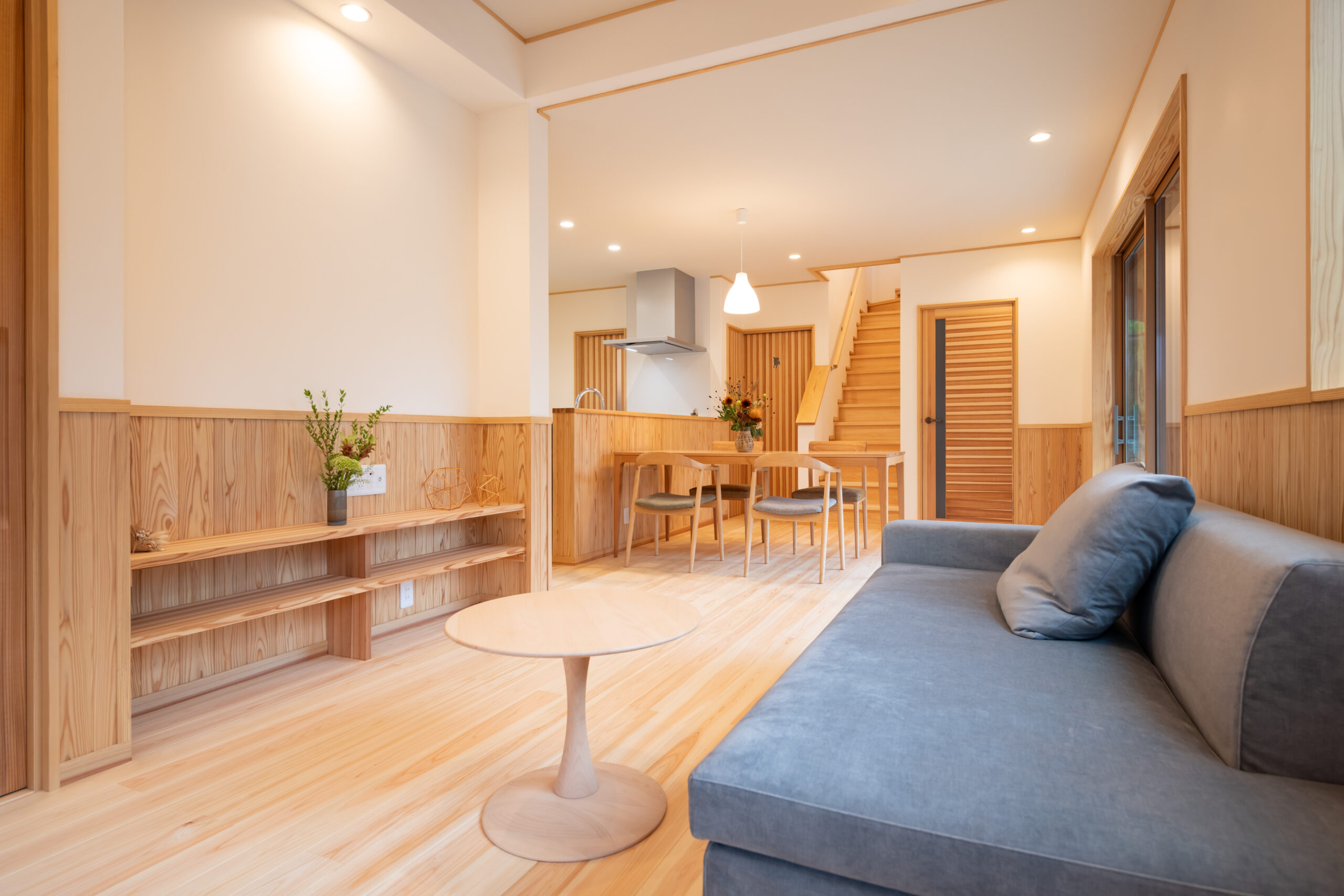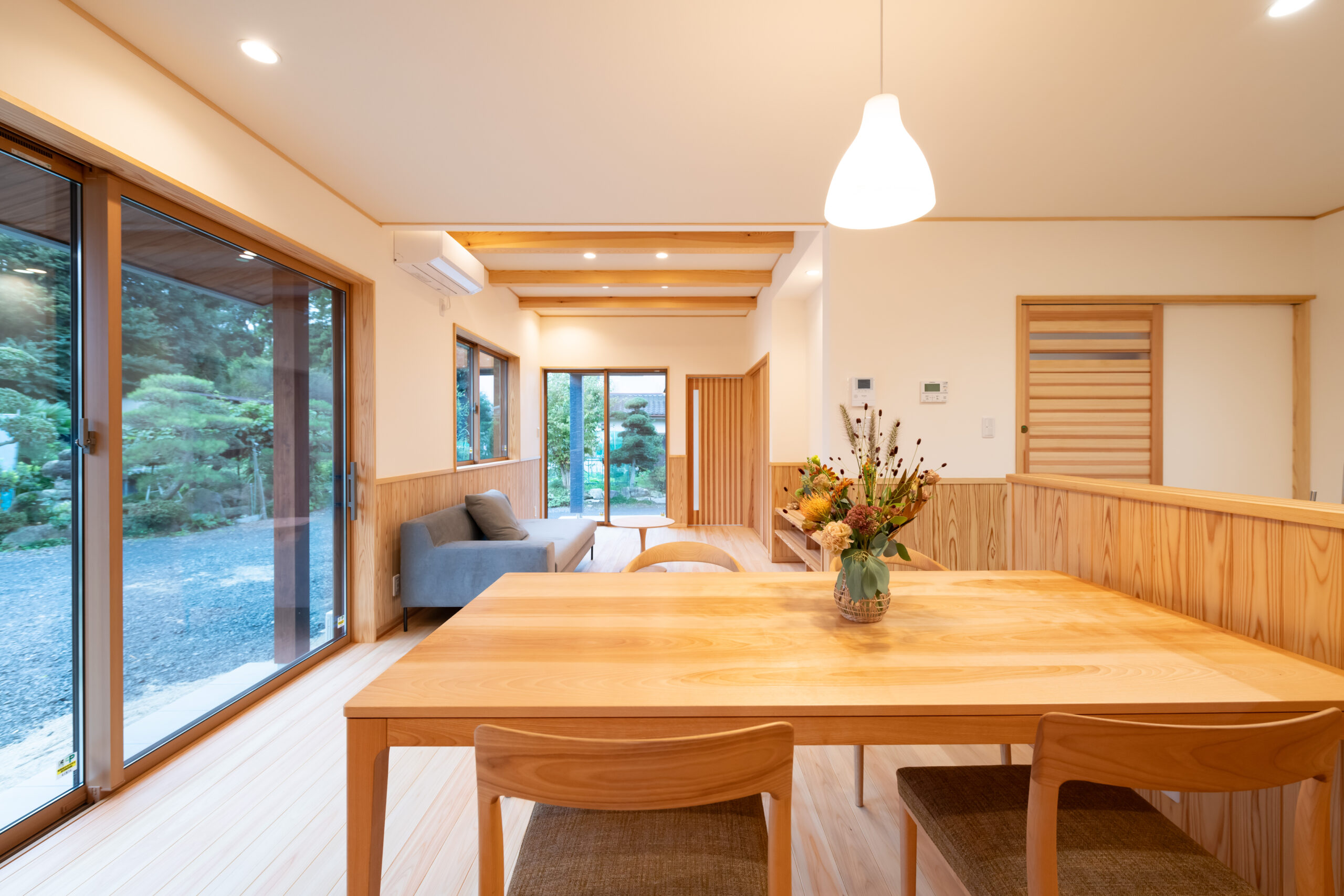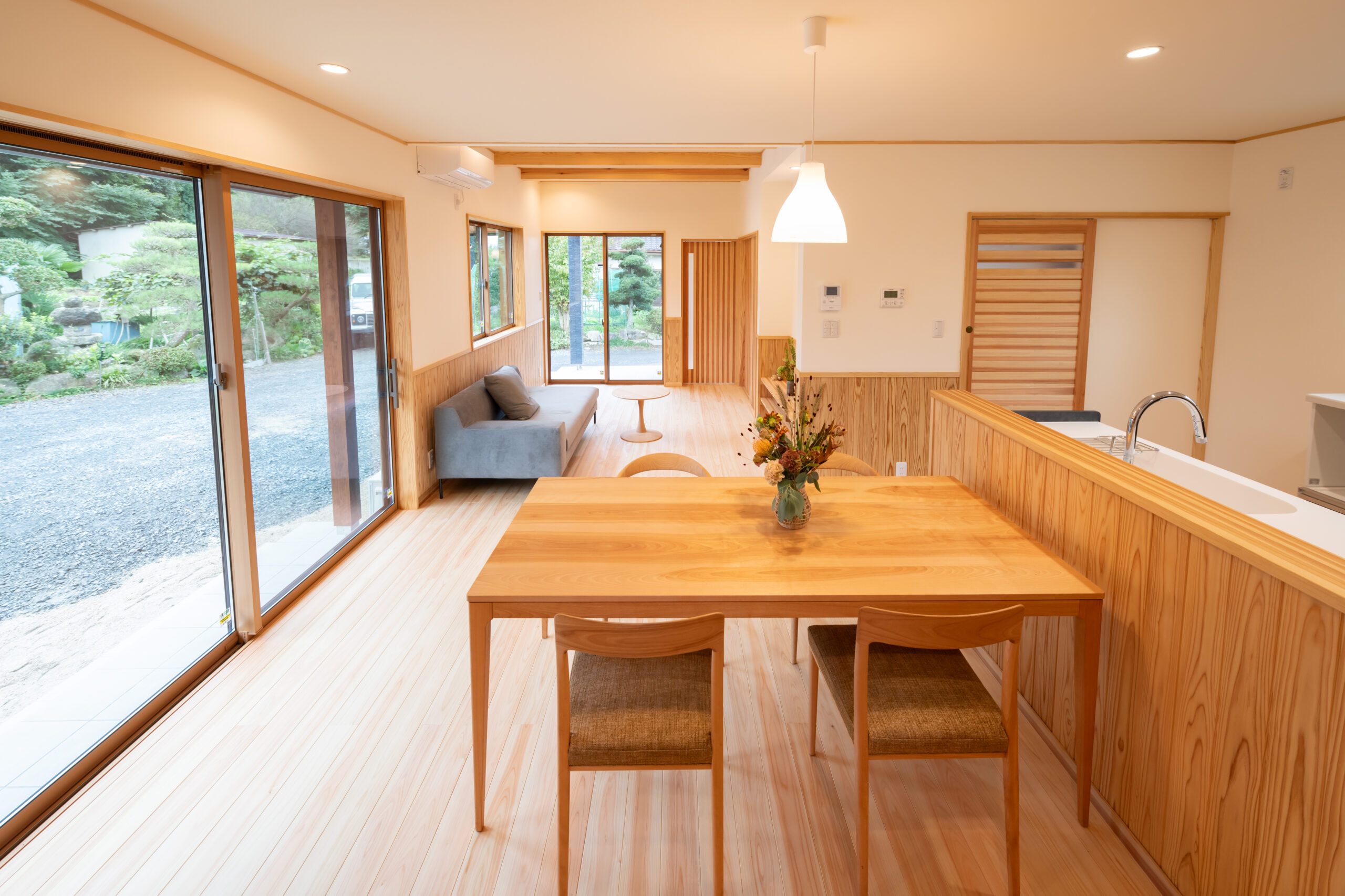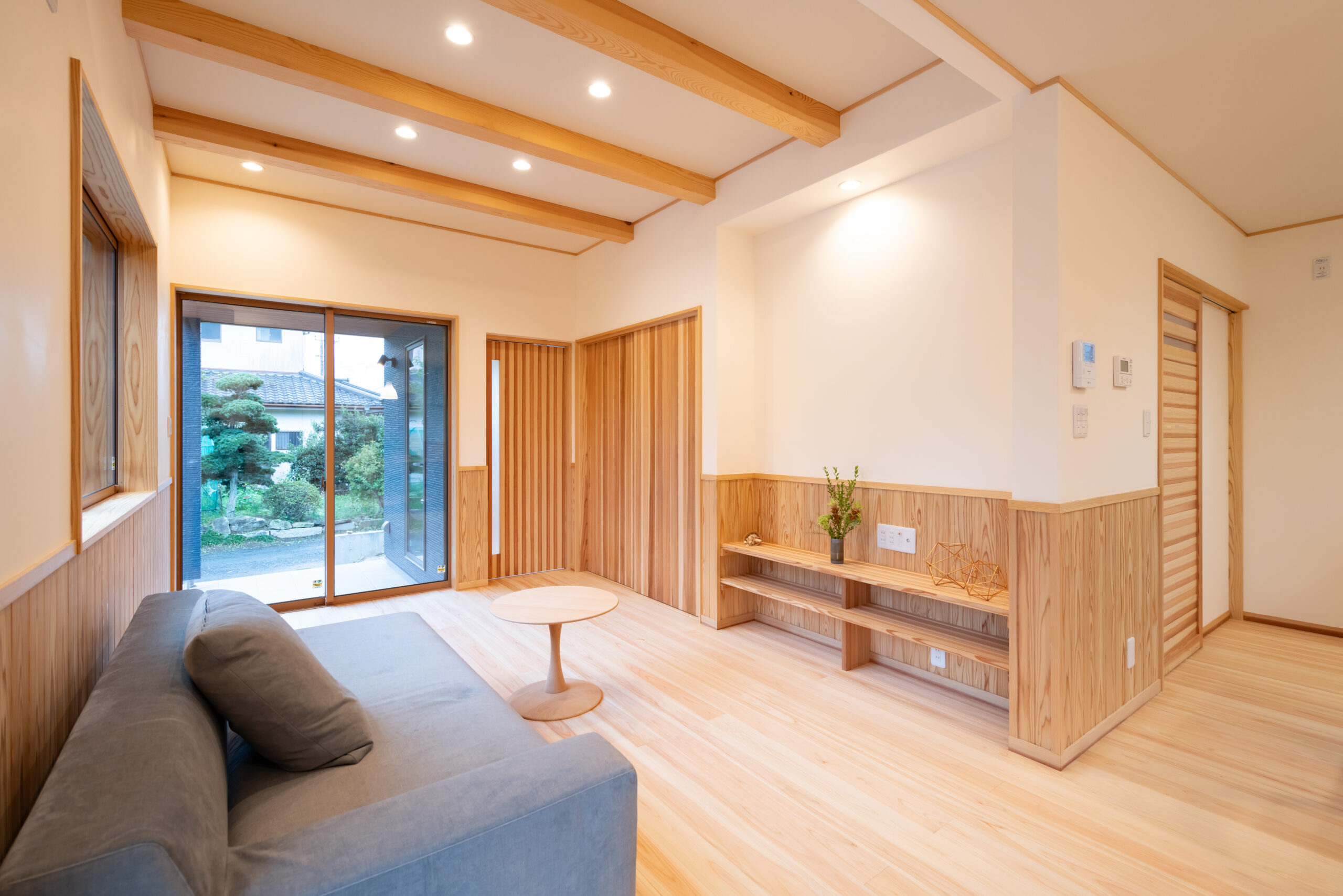 室内に一歩入ると、桧の床と柱、建具が迎えてくれます。