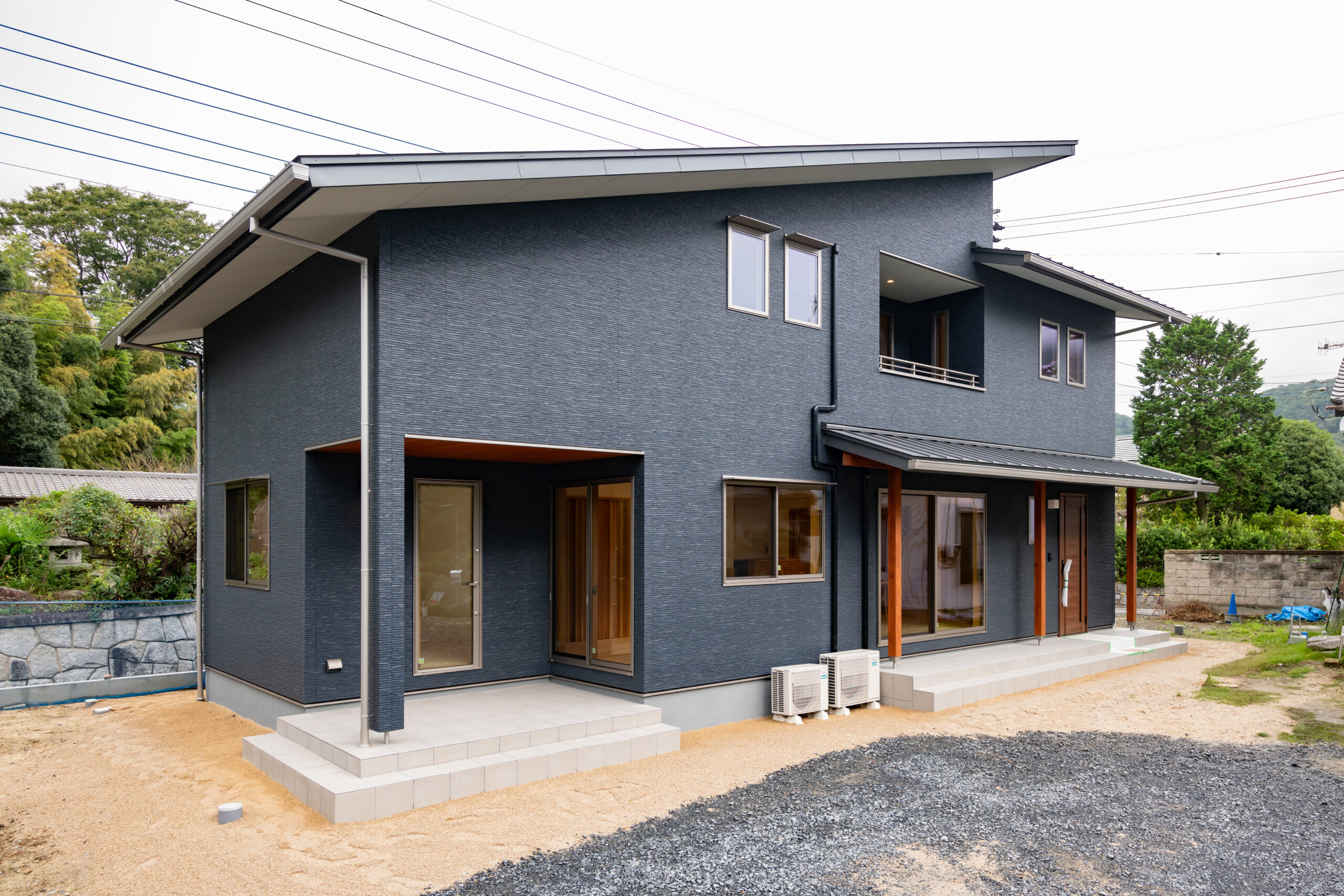 外壁の落ち着いた色合いと、木部のやわらかな表情が調和する佇まい。