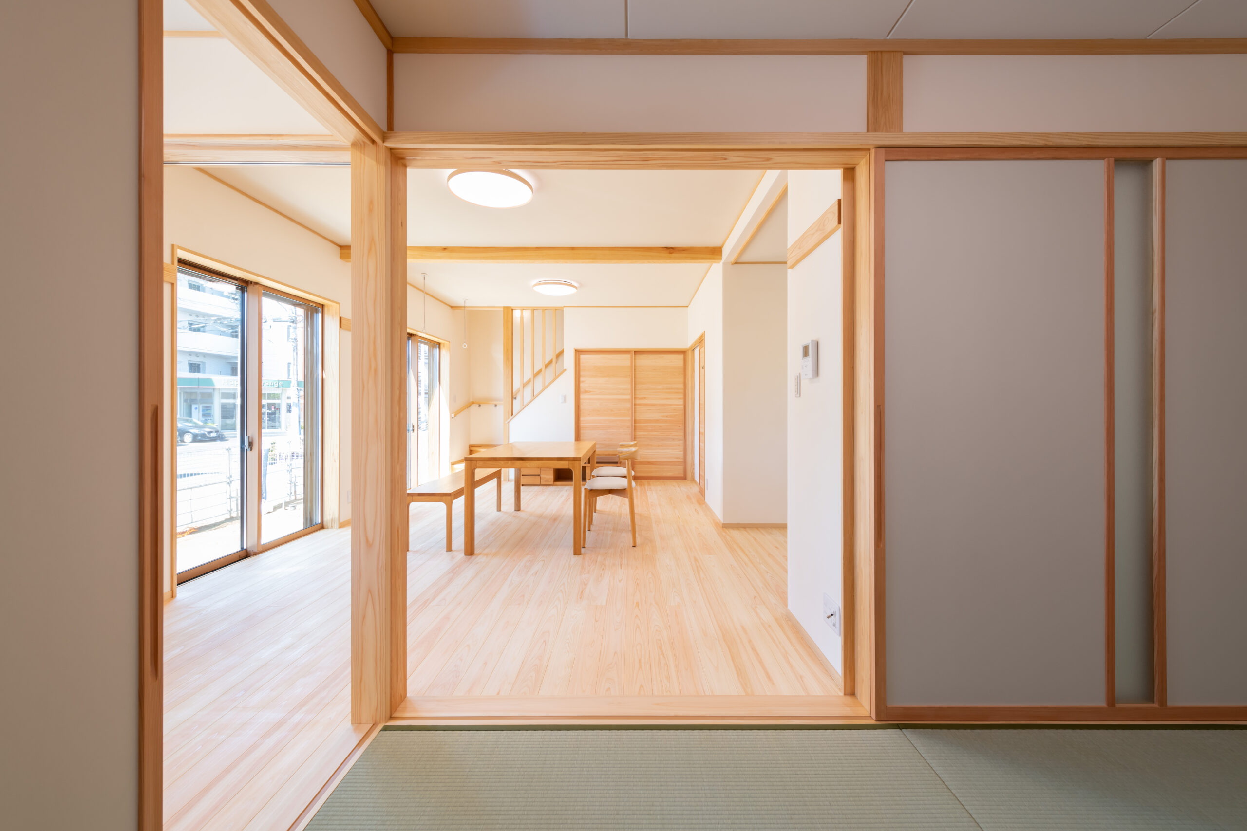総二階の桧の家 つくば市二の宮 物件概要 所在地 つくば市二の宮 建築面積 119.23㎡(36.00坪) 延床面積 138.29㎡(35.25坪) 構 造 木造2階建て 2階建ての優しい佇まいの外観。 内部は桧を中心とした国産材と漆喰で仕上げられています。 玄関から客間として使う和室への動線、リビングの広がりや水回りのアクセスなど、生活のしやすさが考えられた間取りになっています。 厚みのある桧フロアや丁寧な造作などの職人の技術や素材を感じる施工と、天然素材の生み出す澄んだ空気を是非感じてください。