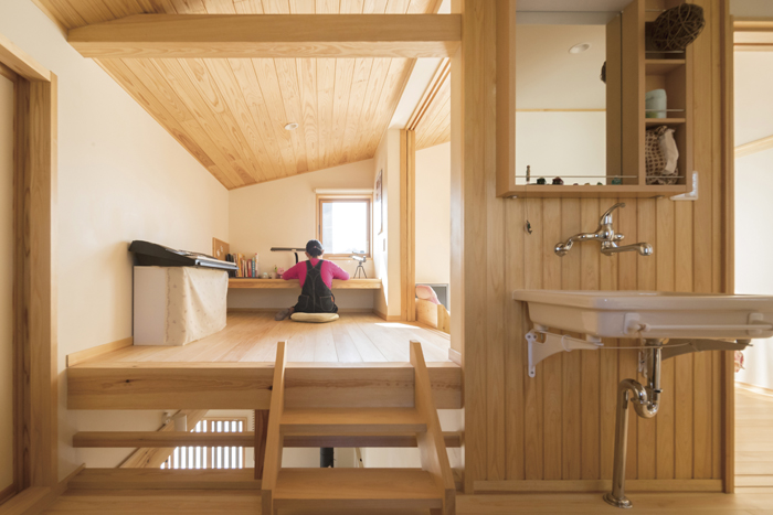 薪ストーブのある無垢の家 常陸大宮市 エアパス効果抜群の迫力ある大屋根。軒の出を深くし、軒裏は杉の無垢板で仕上げ。 物件概要 所在地 常陸大宮市 建築面積 44.3坪 構 造 木造二階建て 美しい床の国産檜や天井の杉板が上品な雰囲気を創出しています。 LDKスペースとして扉や間仕切り壁を無くすことで、開放的な大空間が広がります。 魅力ある広い土間に薪ストーブが引き立ちます。 土間の大谷石にこだわりとセンスが光ります。 遊び心をくすぐるスキップフロアを子供部屋の隣に設置することで、1階にいる家族の声がつながる空間になりました。